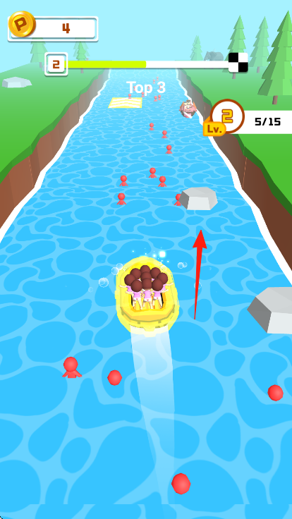 2、木筏行驶中,避石头等障碍,超对手,保排名,收集金币,向终点冲刺,完成挑战。