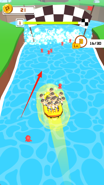 3、引导木筏躲章鱼、石头,积累金币,提升等级,冲过终点,赢比赛,解锁新关卡,继续竞速。