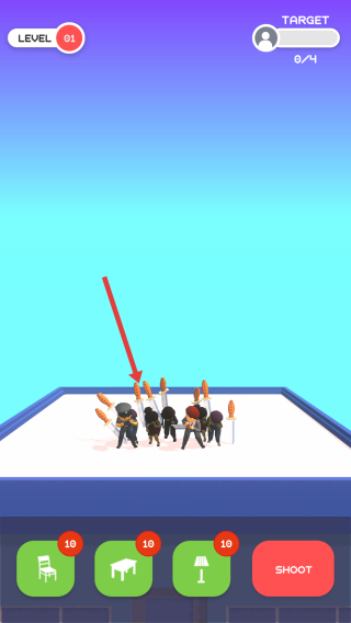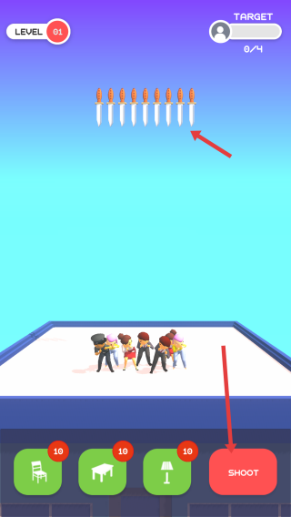 1、进入Level01关卡,观察上方排列的飞刀,点击右下角SHOOT按钮,尝试将飞刀投掷到人群上方区域,完成目标收集。