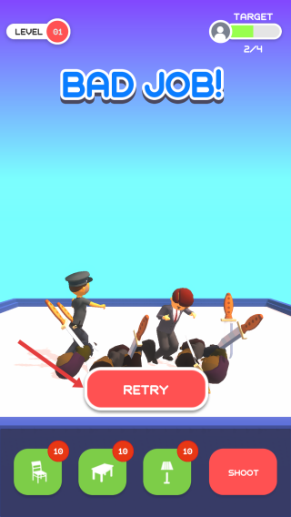 3、若投掷失误,点击RETRY按钮重新开始关卡,调整投掷策略,重新尝试精准投掷飞刀,完成目标,推进游戏进程。