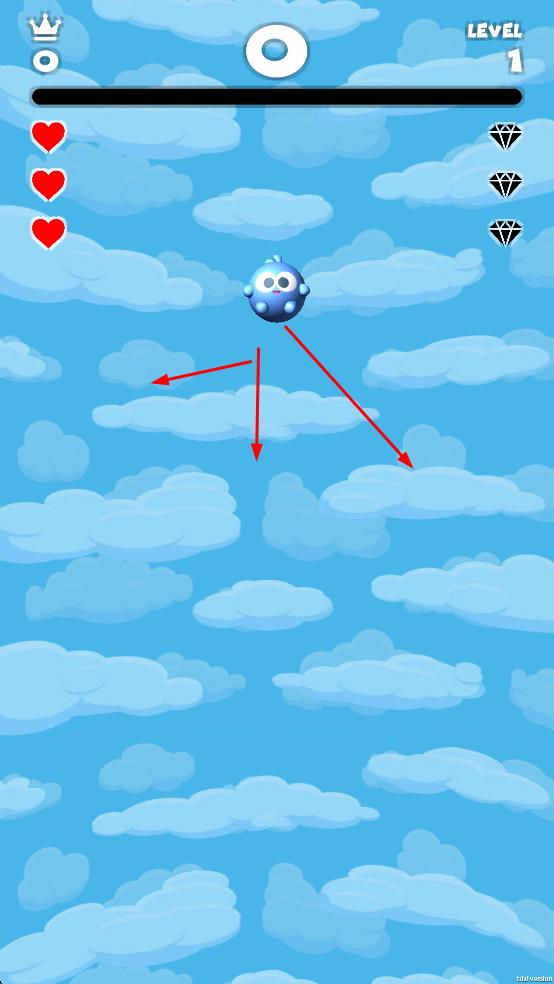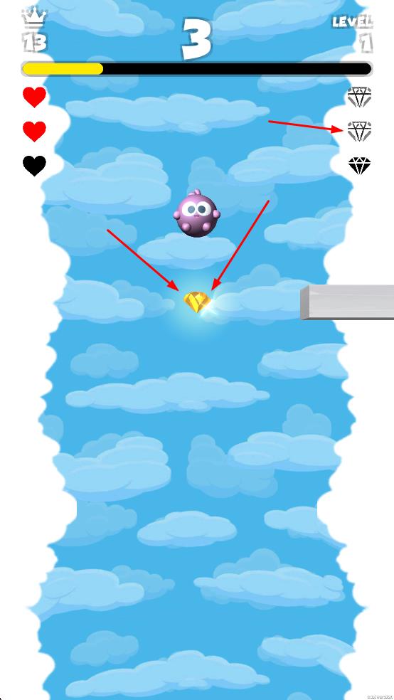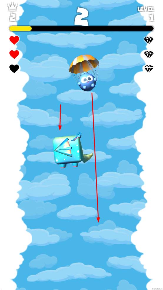 1、进入Level1关卡,操控蓝色怪物沿箭头指示方向下落,留意左上角爱心数量,保障存活。