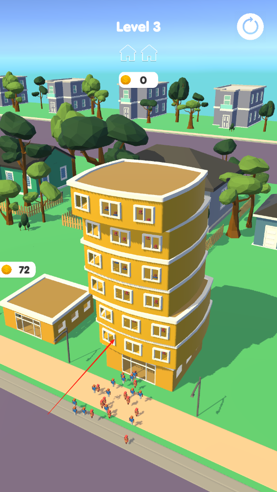 2、当楼层搭建到目标楼层之后,人员想要住进去,长按屏幕即可将每个楼层塞满,但要注意,不能过满,及时松手否则会导致整栋楼爆炸。