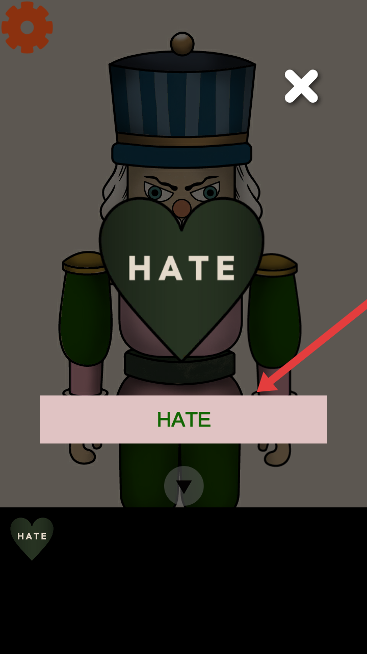 2、遇到胡桃夹子雕像时,点击雕像的胸前标有HATE的粉色爱心,获取这个道具到我们的道具栏中,可能是某个谜题的道具。