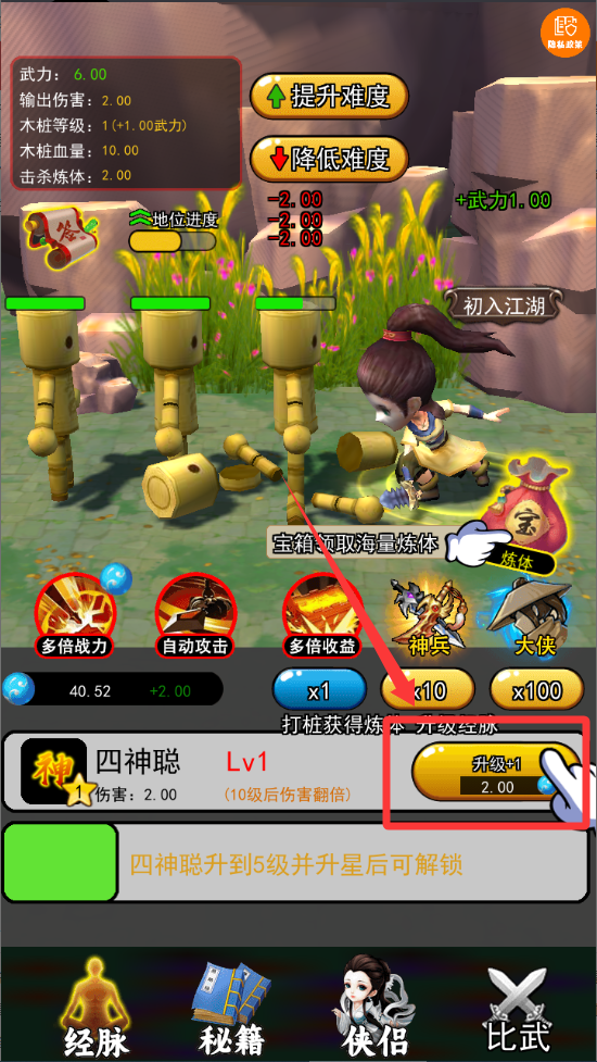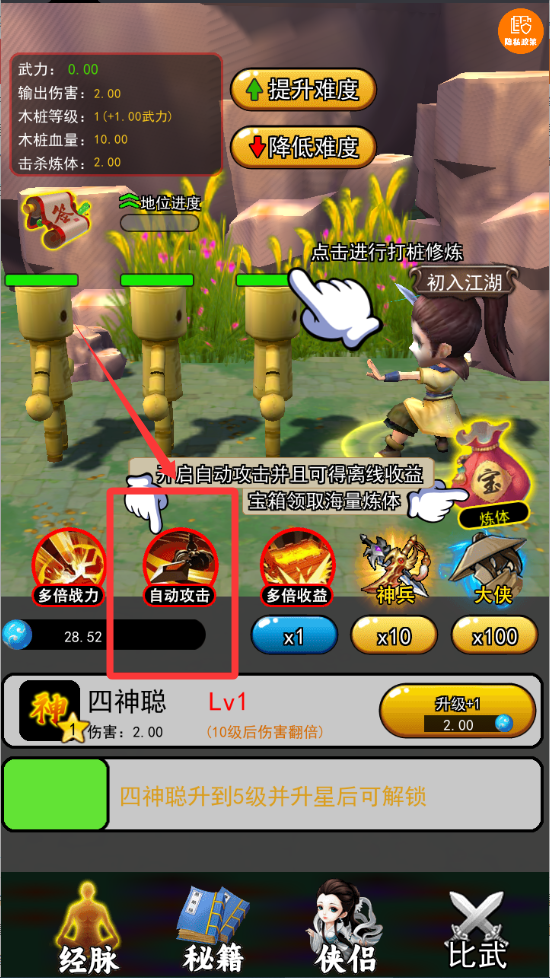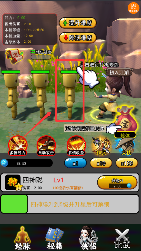 1、点击一下打桩修炼可以增加武力值。