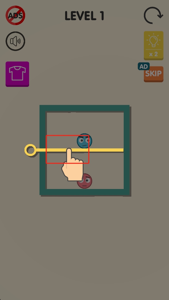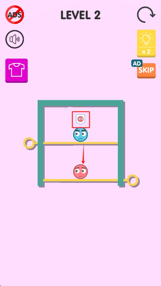 2、这里我们先处理上方红框的红色表情球,通过移除或调整横杠,让蓝色球安全下落,到达红色球位置,达成关卡目标。