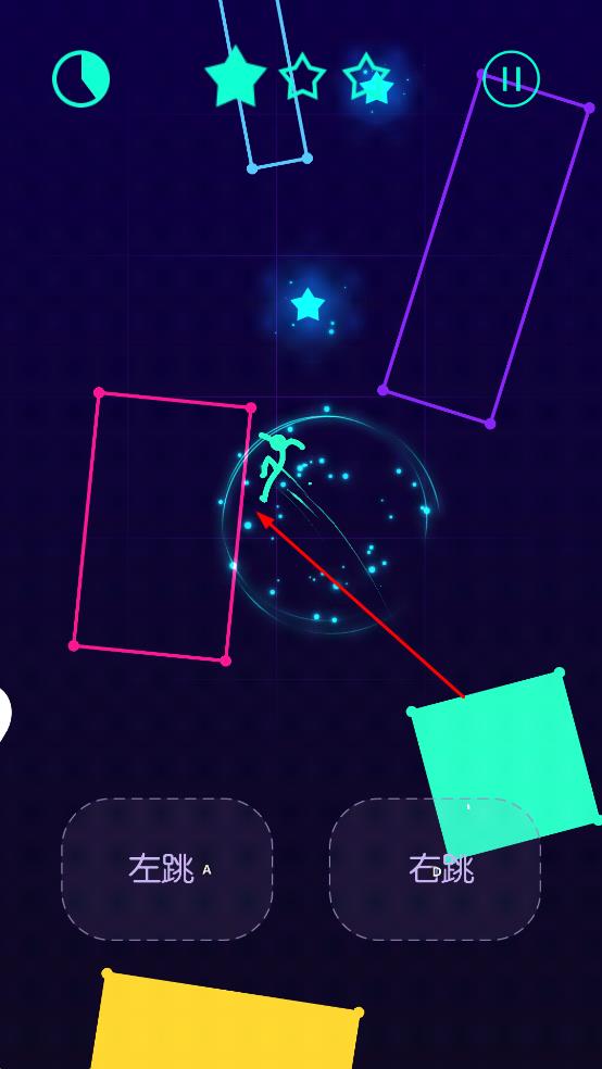2、跳跃时借助角色光环,躲避彩色矩形障碍,同时收集蓝色星星,推进关卡进程。
