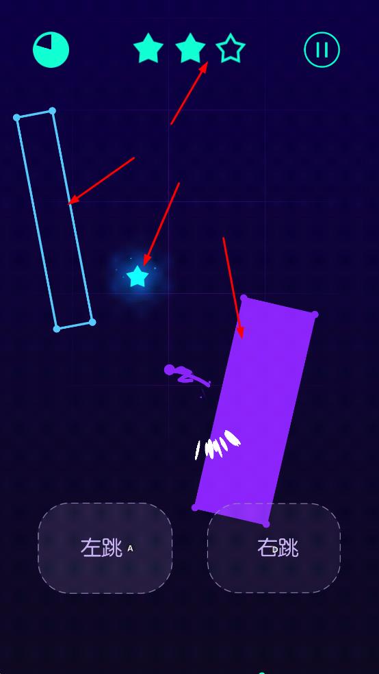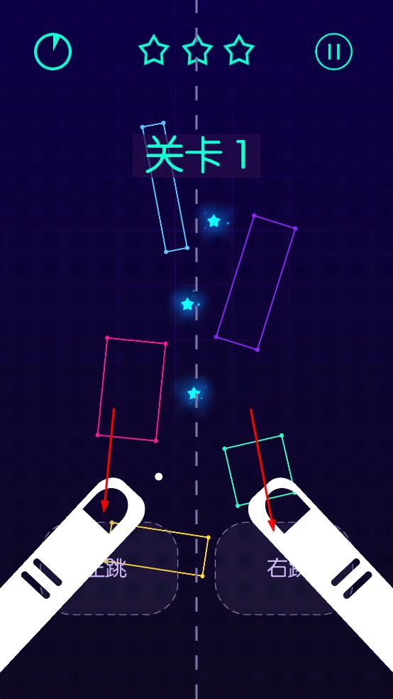 3、持续调整左右跳方向,避开紫色、蓝色矩形障碍,争取收集全星达成三星评价。