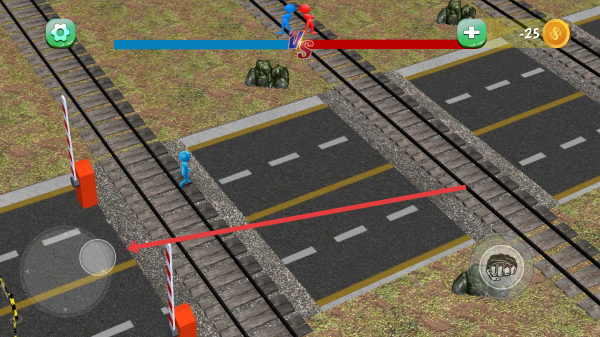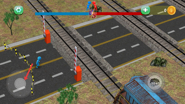 1、滑动左侧摇杆控制蓝色火柴人移动,穿过道口时,注意躲避障碍栏杆、火车,接近红色阵营区域。