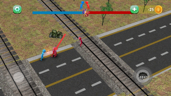 1、生死较量闯关:突破障碍、穿越赛道,与红色火柴人展开生死较量,在铁路场景中进行激烈对抗,每一次交锋都充满紧张感,考验玩家的格斗与反应的能力。