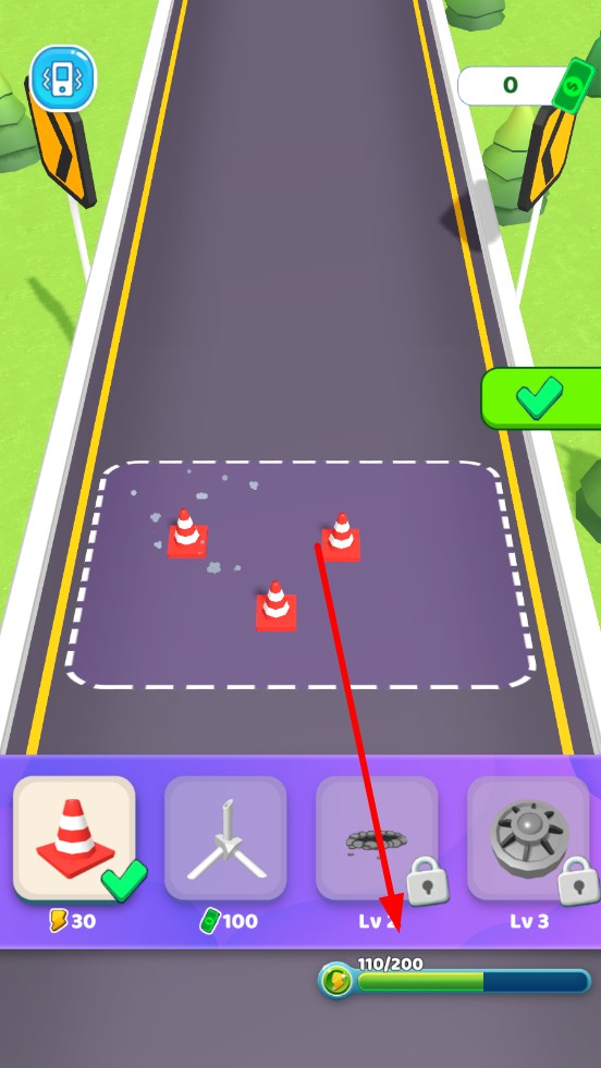 3、收益最大化:计算每关金币,优先升级路钉,性价比最高;攒钱解锁地陷,单次破坏收益翻倍,金币不足时暂升锥形桶形成低成本高回报循环。