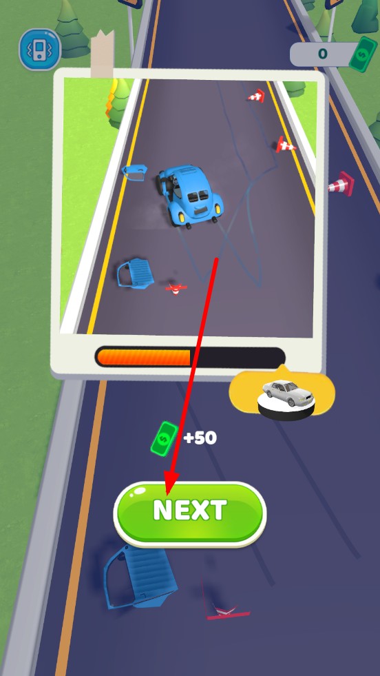 3、当汽车破坏度达临界值进度条满,触发NEXT按钮,点击进入下一关,解锁地陷、旋转钉等新障碍,留意新障碍的特性,应对更坚固、高速的车辆。
