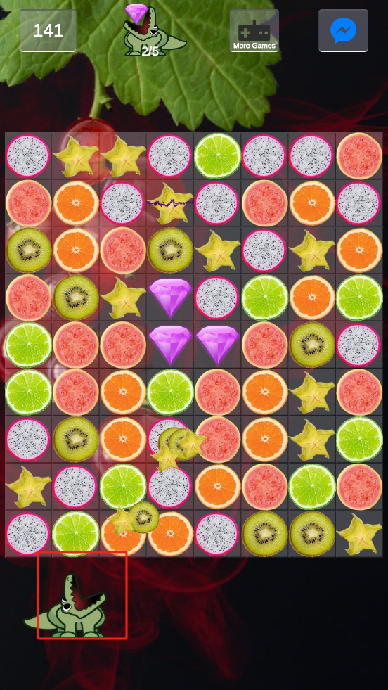 1、观察水果布局,优先消除红框内紫色钻石周边水果,让钻石下落,借助消除特效,触发连锁反应,收集钻石。