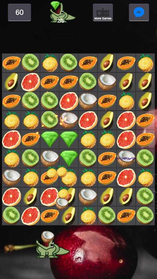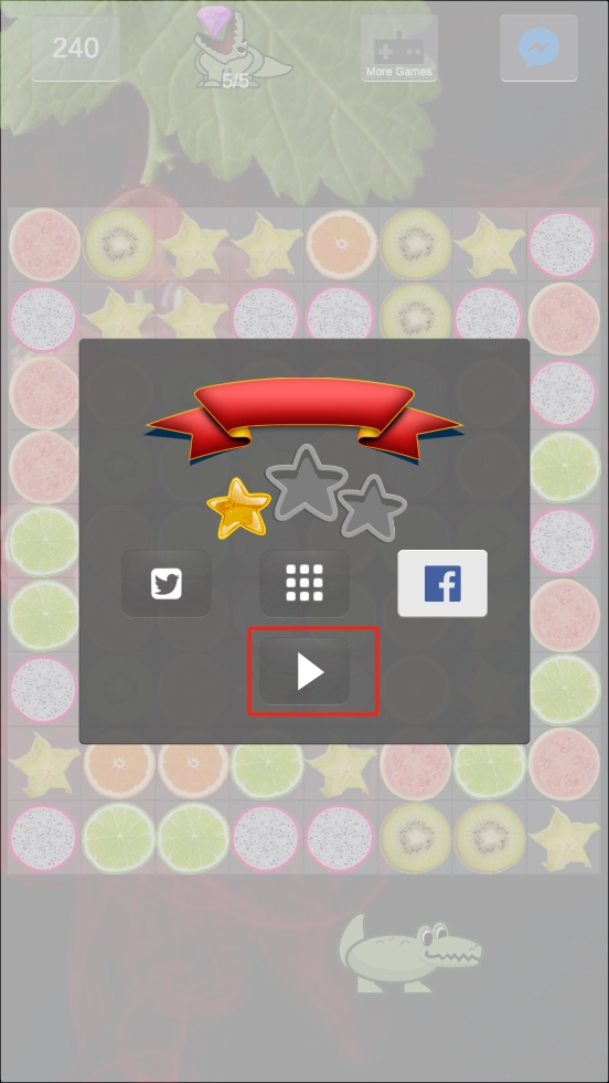 3、钻石收集满5/5后,出现通关界面,点击红框播放键,进入下一关,继续挑战更高难度水果消除。