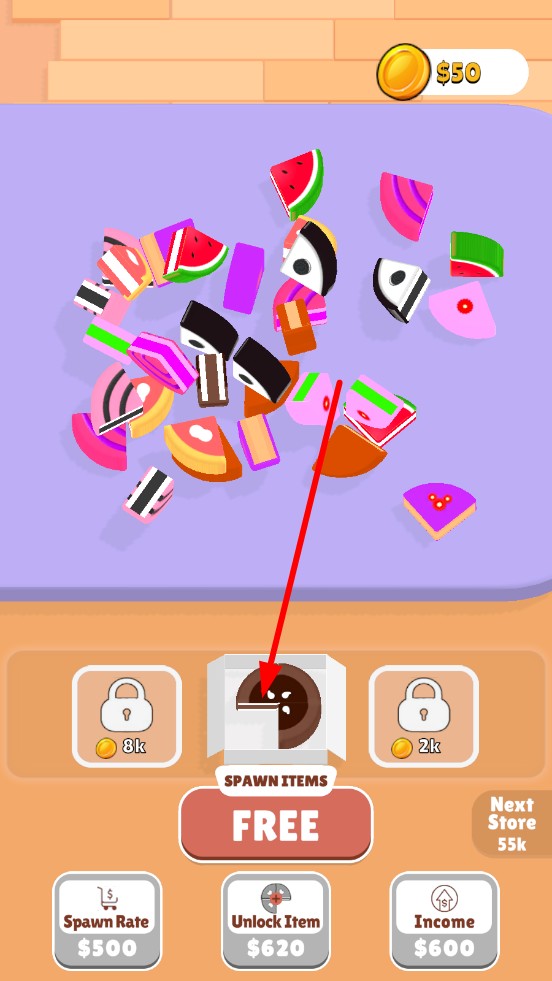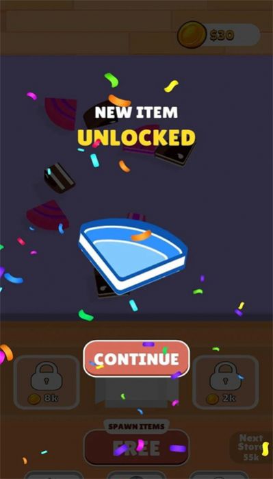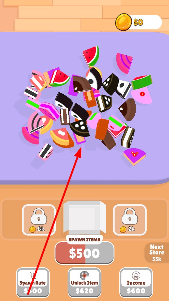 3、消耗金币升级Spawn Rate加速投放,Unlock Item解锁新蛋糕,Income拔高收益;科学规划升级顺序。