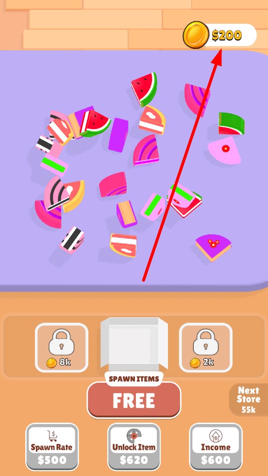 1、初期节奏把控:开局专注点FREE放置,优先保证同型蛋糕数量充足,快速铺场形成同型聚集布局;攒够启动金币立即升Spawn Rate,加速蛋糕产出频率。