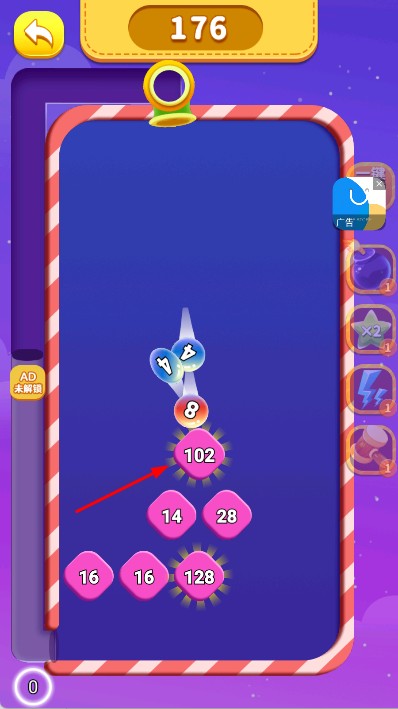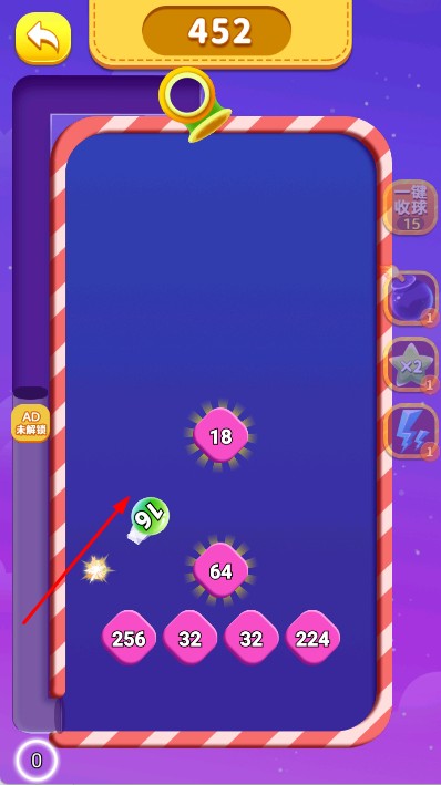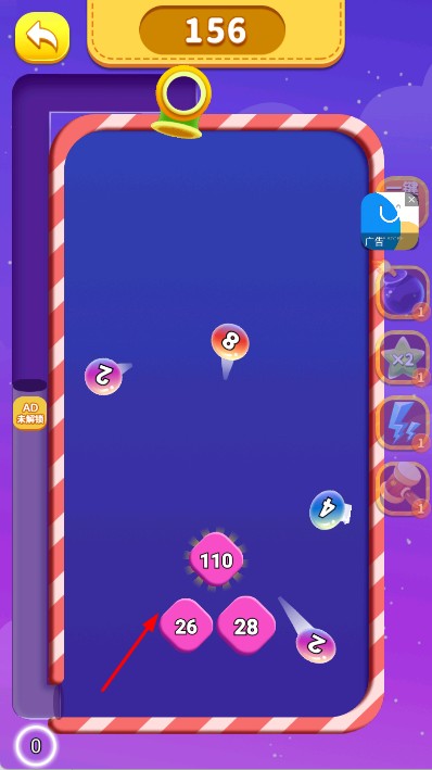 2、在关卡内,屏幕上方有数字小球,下方有带数字的粉色方块,点击粉色方块,发射对应数字小球到上方区域,让小球碰撞、合成。