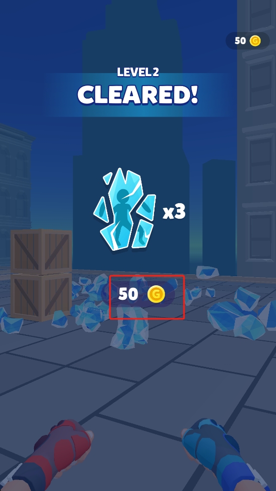3、通关后,获取50金币奖励,可用于商店购买道具、升级技能,点击金币区域或继续按钮,进入下一关挑战。