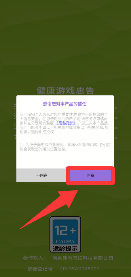 1、点击红色框框里的同意并进入游戏。