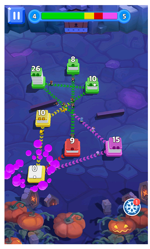 1、独创城池吞噬玩法,通过增援同色据点扩张领土,并吞并弱小异色城池,融合塔防与战略元素形成独特对抗模式。