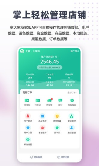 享大家商家版软件是非常好用额的一款帮助商家管理店铺的手机app,在这里用户们能够快速的看到自己店铺中的各种各样的订单,还能够看到各种便捷的管理功能,让用户们可以在这里将自己的店铺管理的更好,更加便捷的维护自己的顾客,让自己能够赚到更多的钱,超级的好用。