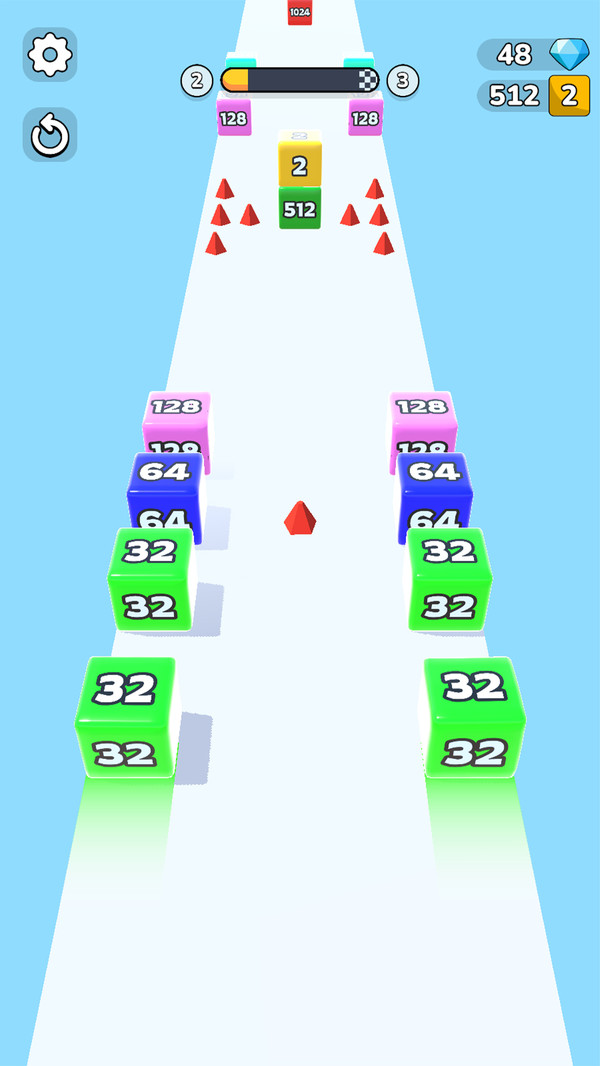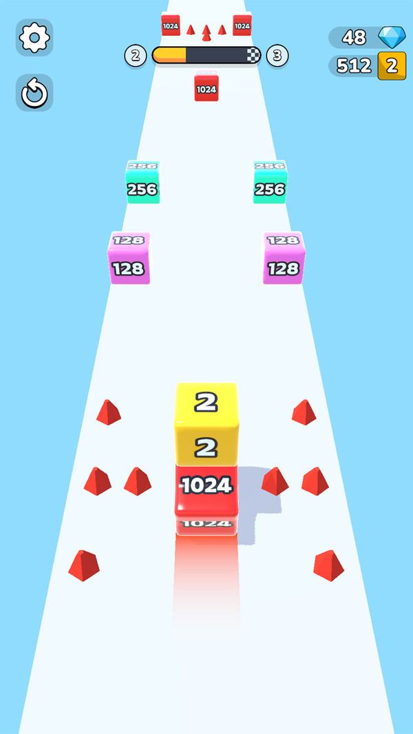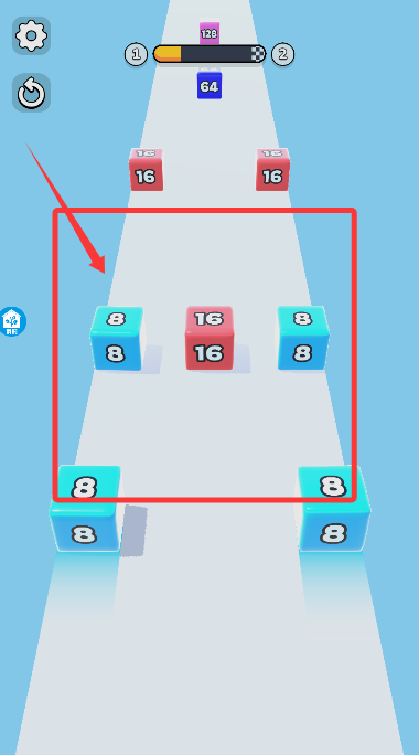 2、灵活避开高数值方块,优先碰撞等值或低值方块实现数字翻倍增长。