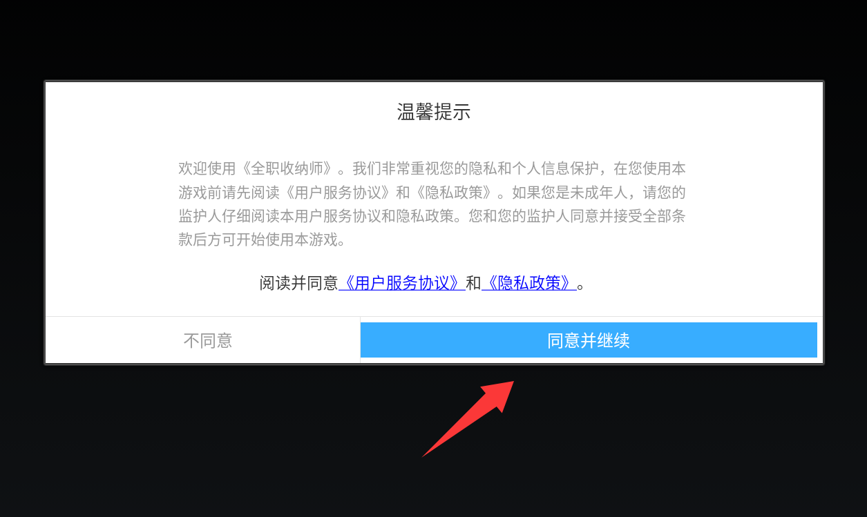 1、点击温馨提示里的同意并继续。
