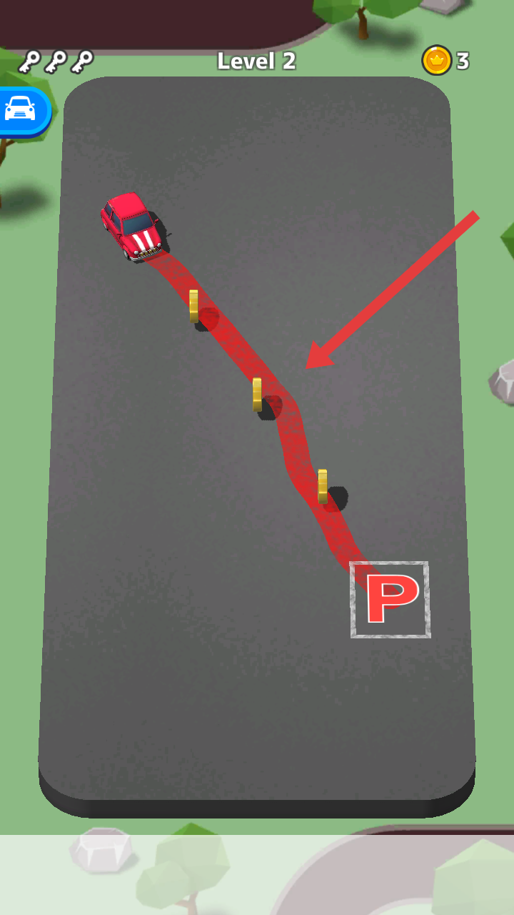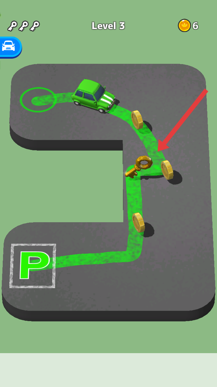 3、操控绿色小车沿着绿色路径行驶,拾取路径中的金色钥匙道具,同时收集沿途金币,最终驶入标有P的停车位。