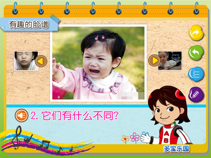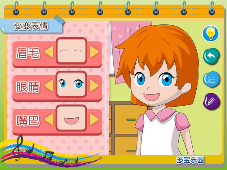 你看到的表情和生活中的表情一样吗?它们有什么不同?你会做出这样的表情吗?形容一下这个表情中五官的形状与位置。和爸爸妈妈一起准备材料,动手画出许多不一样的表情。最后,点击眉毛、眼睛和嘴巴,组合看看会变出什么表情。