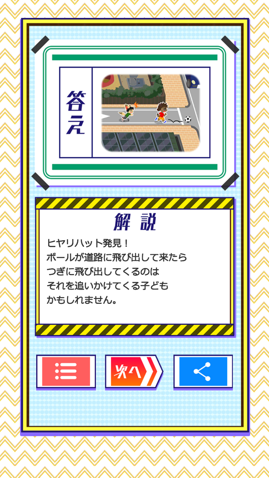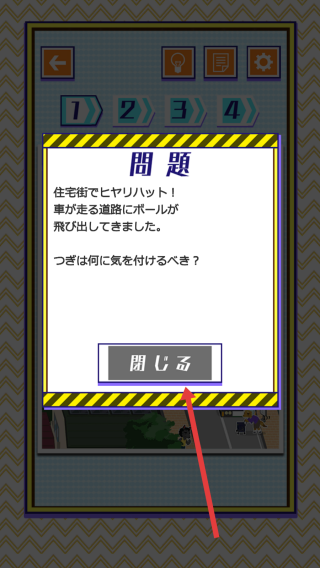2、在问题界面点击閉じる关闭弹窗,查看住宅街でヒヤリハット!車が走る道路にボールが飛び出し的情境,思考需留意的安全细节。