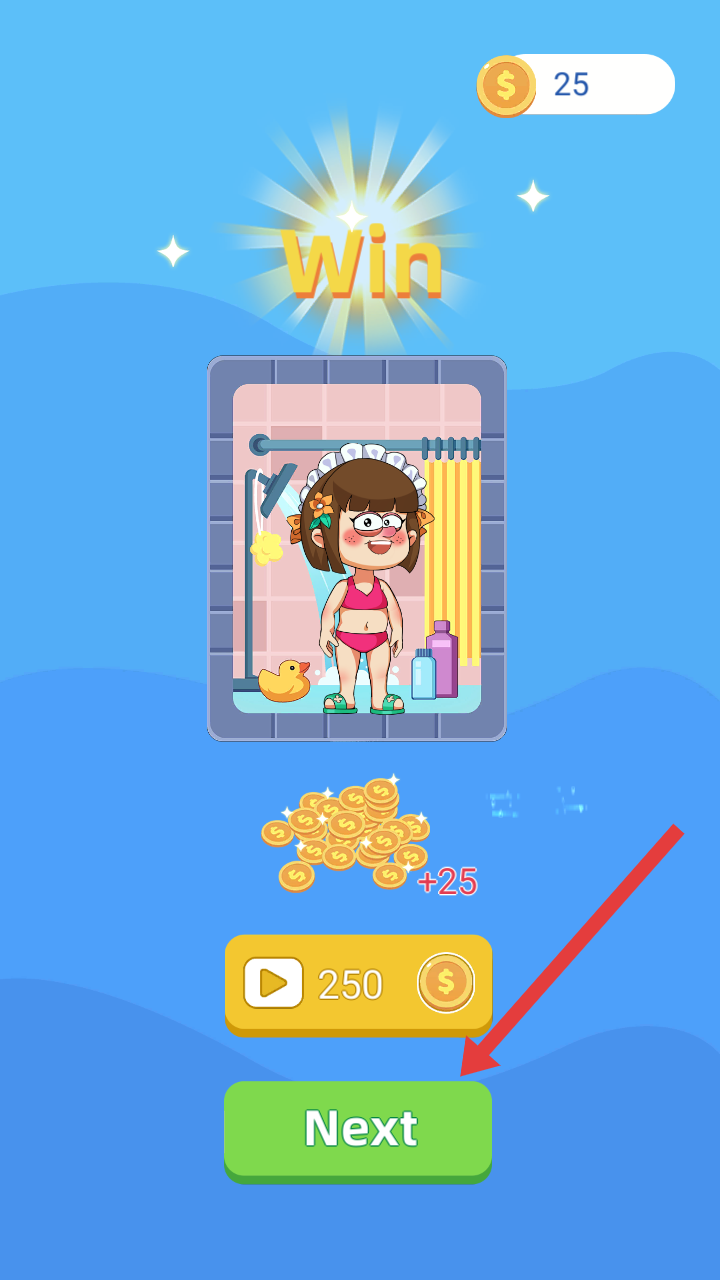 1、在完成新手第一、二关关卡后,弹出胜利的界面,点击绿色Next按钮,进入Level3的关卡。