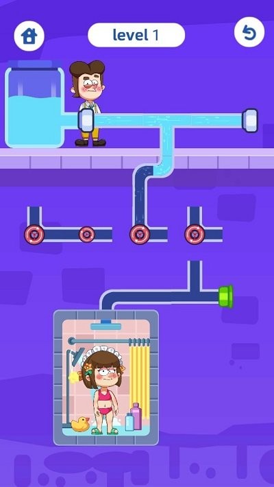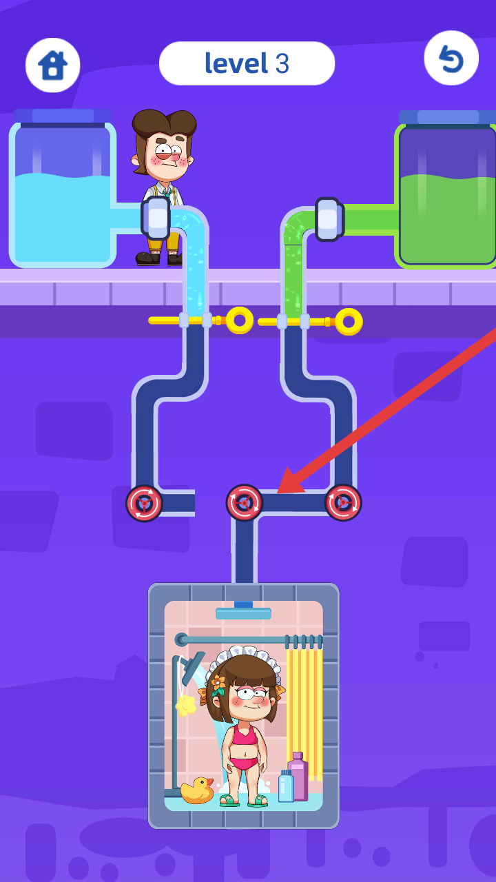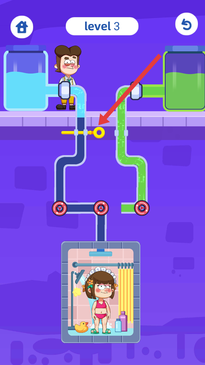 2、观察Level3的管道布局,左侧蓝色清水、右侧绿色液体,需要通过黄色开关和红色转轮控制水流。
