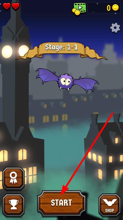 1、进入逃命蝙蝠,选定首个关卡,操控蝙蝠从起点出发,躲避初期出现的简单障碍物。
