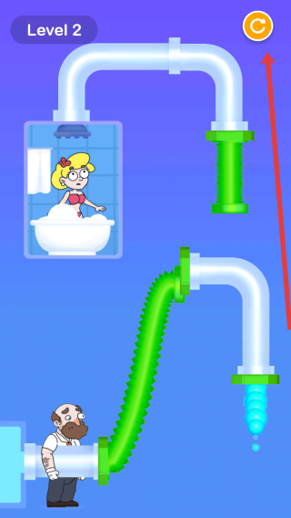 3、进入Level-2,观察管道布局,若连接有误可点击右上角重置图标,重新调整绿色软管,保障水流顺利输送至浴缸。