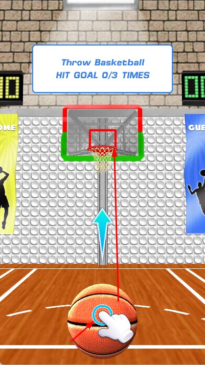 2、依据提示,长按篮球并拖动瞄准篮筐,松开手指完成投篮,需在规定次数内命中目标。