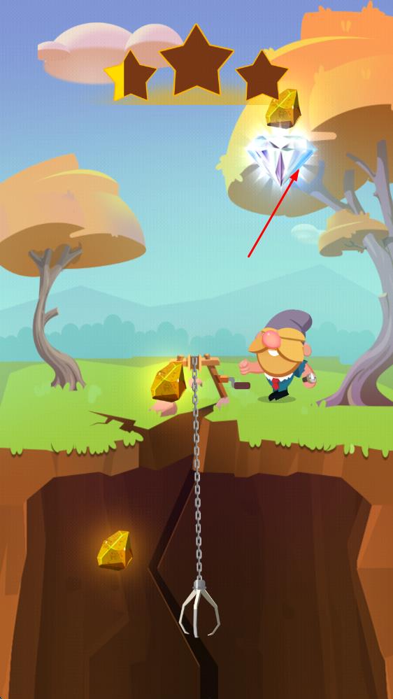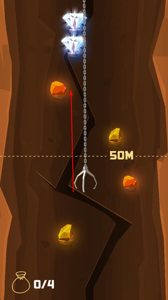 1、进入挖掘机掘进机的世界,先熟悉操作:点击屏幕释放铁链钩子,让其深入地下裂缝,瞄准钻石、金币等目标,尝试首次捕获。