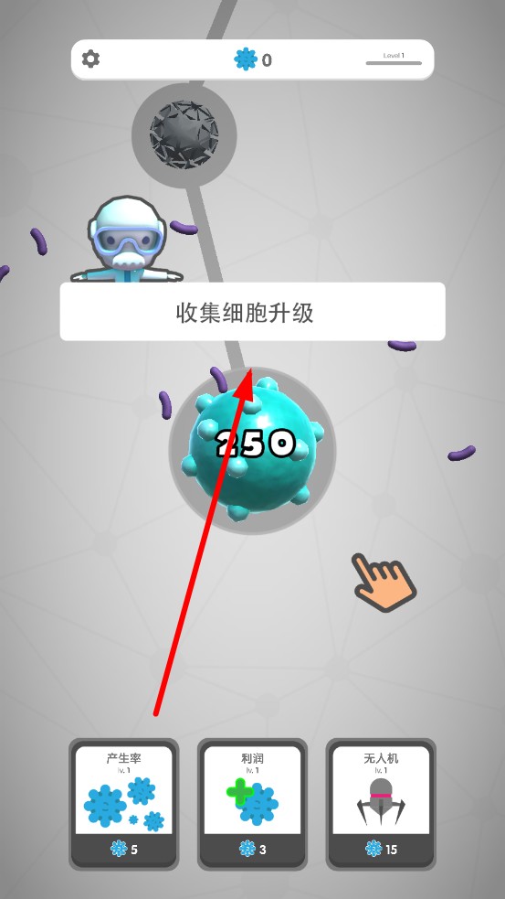 1、点击屏幕中央显示数值的病毒主体,点击病毒身旁路过的紫色细胞,获得更多的病毒数量,用以升级。