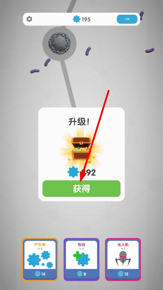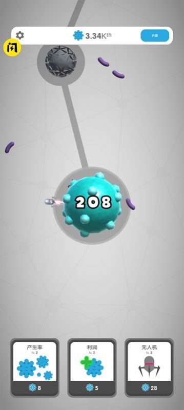 2、细胞储备达要求时,下方产生率、利润即可升级,升级完成后,细胞生成速度加快,收益数字跳跃式增长,直观感受病毒的变强。