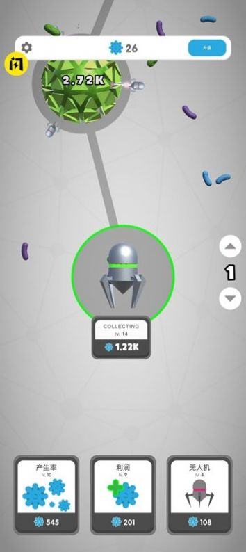 2、模块连锁效应:产生率让细胞如气泡冒起,利润使单次收获数字暴增,无人机化作银翼穿梭自动采集;错序升级会让节奏紊乱,策略搭配左右进化快慢。