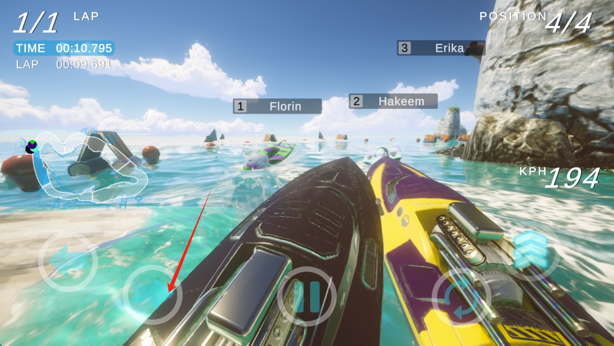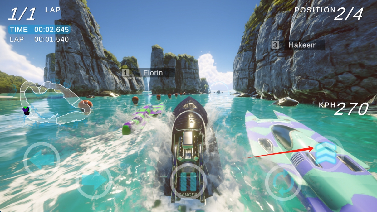 3、适时点击加速按钮,提升速度,超越对手,争取赛道第一,点击按钮使游艇转向位置。