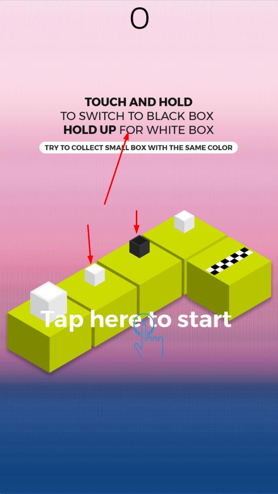 1、启动游戏切换颜色:按大格子开启游戏,按住屏幕时大盒子变为黑色,松开则恢复白色,通过按压与松开的操作切换颜色,确保与即将经过的小盒子颜色一致。