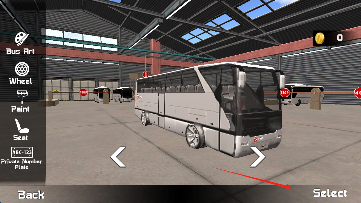 2、车库选巴士,自定义外观后点Select,确定所选车辆,点击按钮选择游戏的车辆。