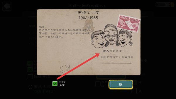 2、在伊格尔小学的信件界面,点击键入你的名字……处输入名称后,点击OK,正式进入游戏世界。
