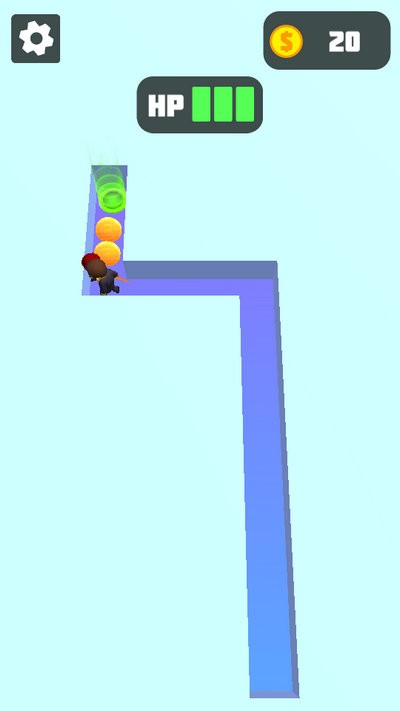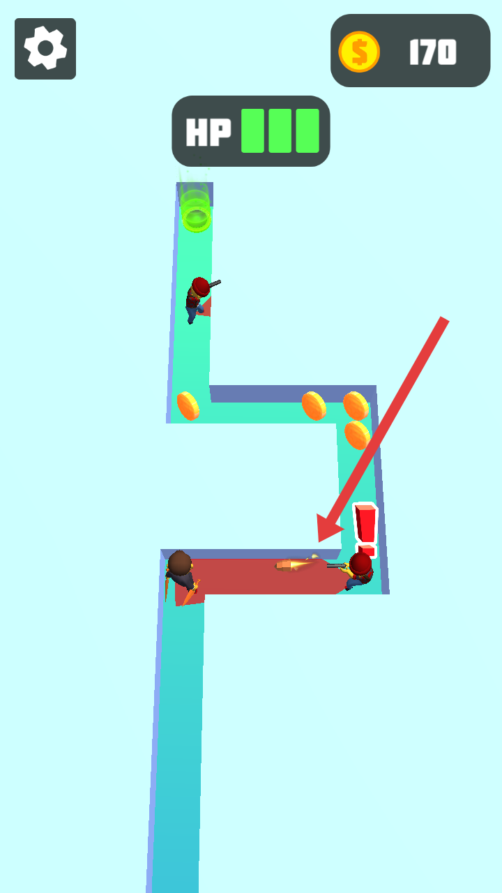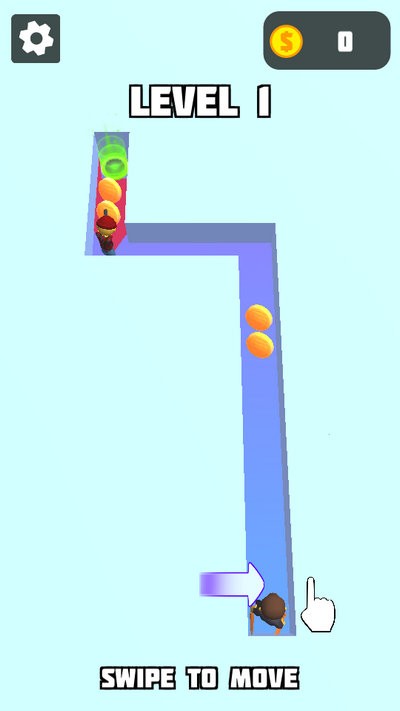 1、在LEVEL2关卡,依据SWIPE TO MOVE提示滑动操控角色,收集道路上的黄色金币,同时留意右侧持枪敌人的分布,规划移动路线。