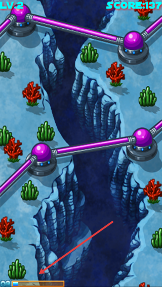 2、关卡中,潜艇沿紫色管道路径移动,避开深沟等障碍,击碎红色珊瑚状敌人,积累分数。