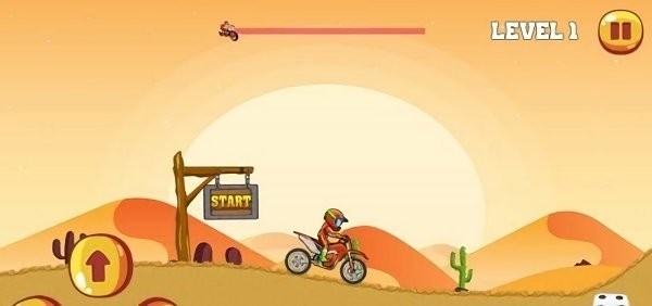 1、操控橙色摩托,点击左下角按钮加速,沿着沙漠地形爬坡,向最前方的终点区域前进,可以查看头上的赛道进程。
