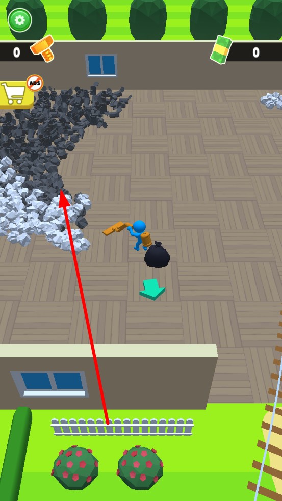 1、操控蓝色小人靠近黑白堆积物,工具自动吸附垃圾,逐渐覆盖囤积区,看着地面从灰黑脏污,逐步显出干净的木质纹理。