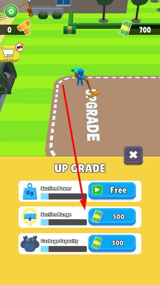 3、点开UPGRADE界面,消耗钞票提升吸力、范围、容量,升级后工具效率提高,清理效率呈阶梯式猛涨。