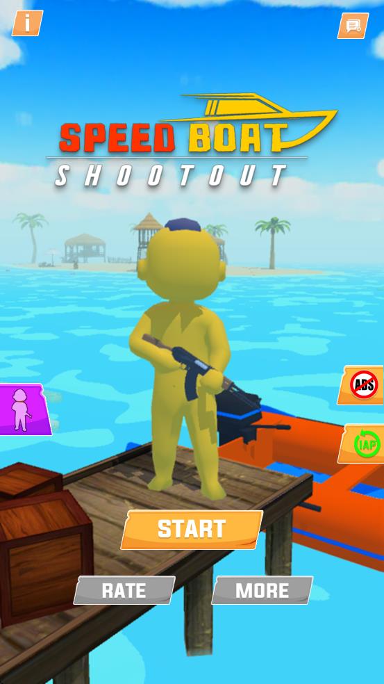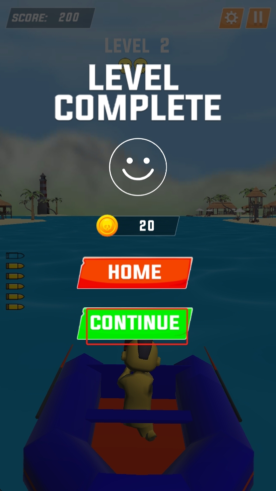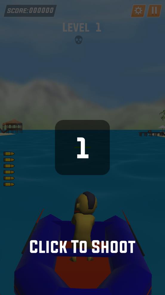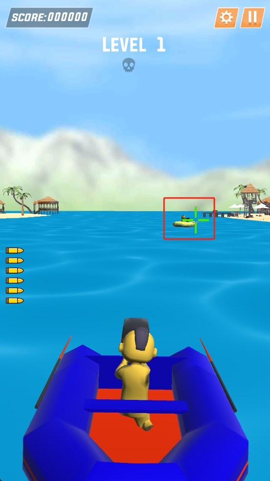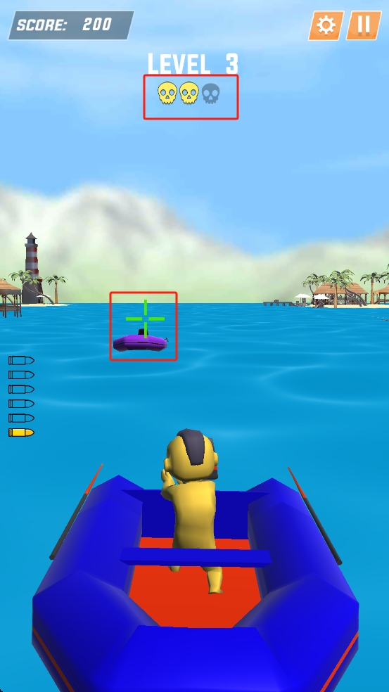1、开局我们操控角色乘蓝色小船,瞄准远处黄色小艇,利用左侧子弹,点击射击目标,避开海域的障碍。