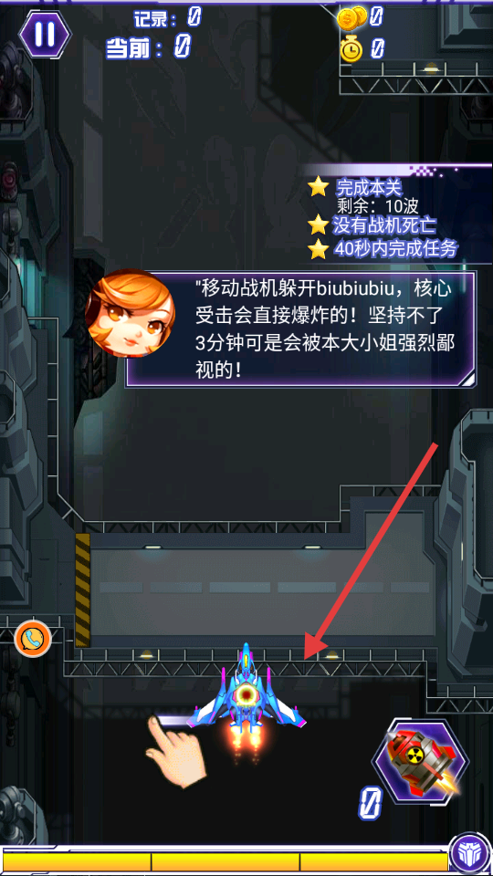 1、通过虚拟摇杆控制战机移动,自动射击按钮持续输出火力。