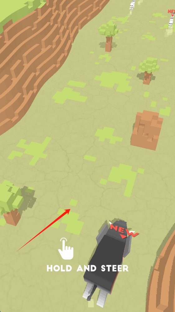 1、游戏开始时按住屏幕操控角色方向,沿绿色地形奔跑,躲避障碍并靠近NEW标识目标。
